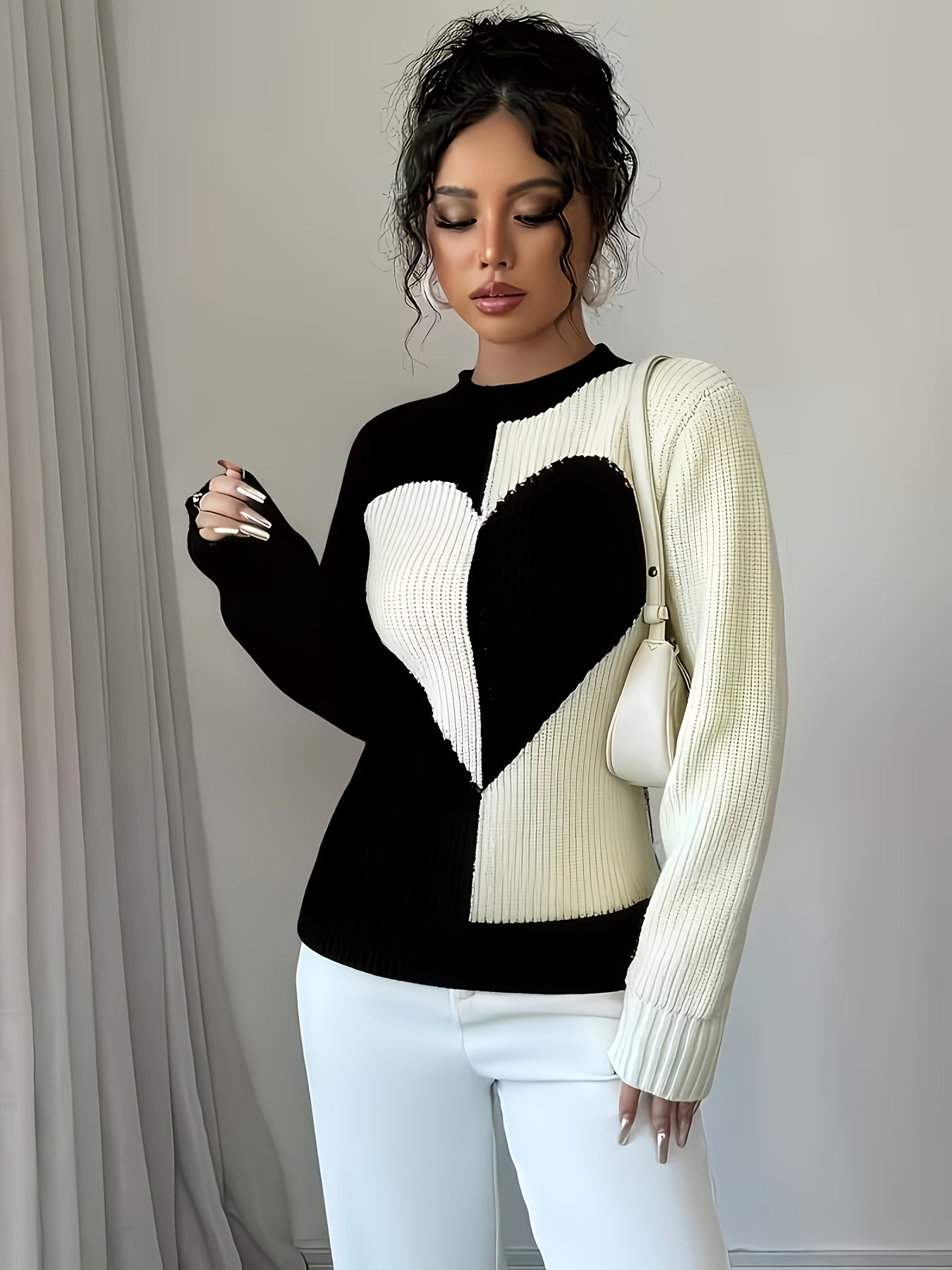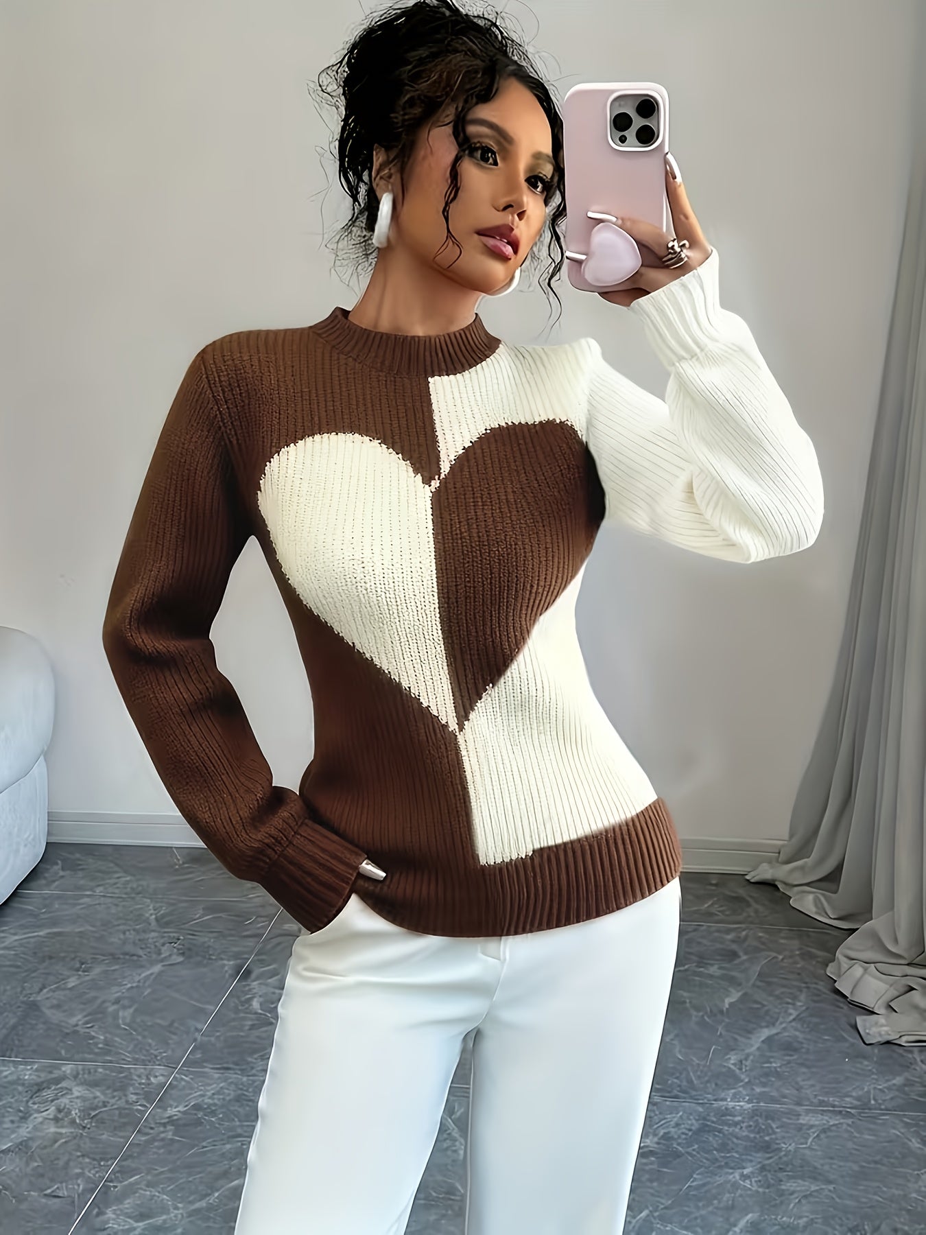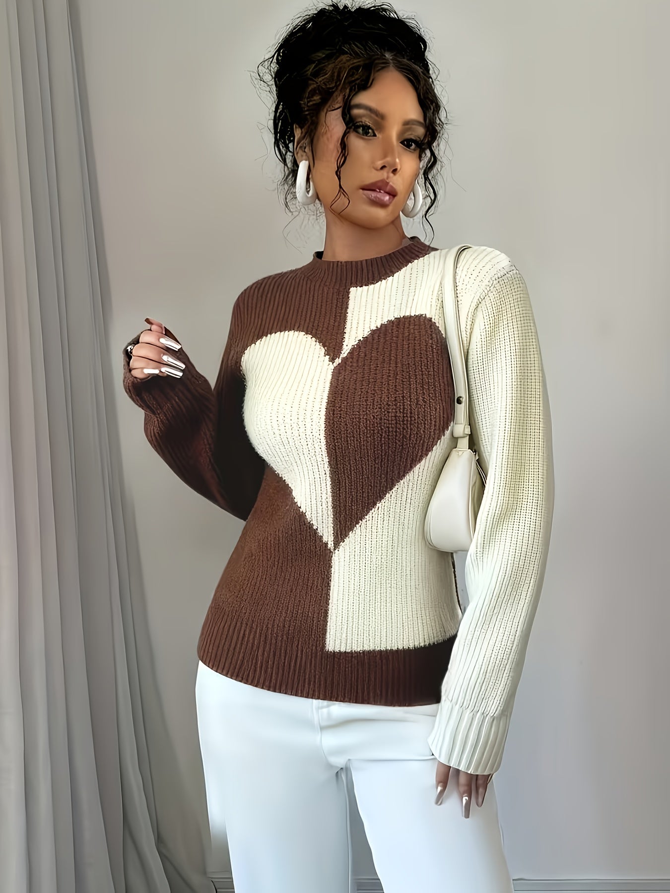 Deze comfortabele damestrui is perfect voor vrouwen die houden van een zachte, warme trui met een verzorgde uitstraling. Het subtiele hartmotief en het rustige kleurblokdesign geven de trui een speelse maar elegante touch, zonder overdreven te zijn.