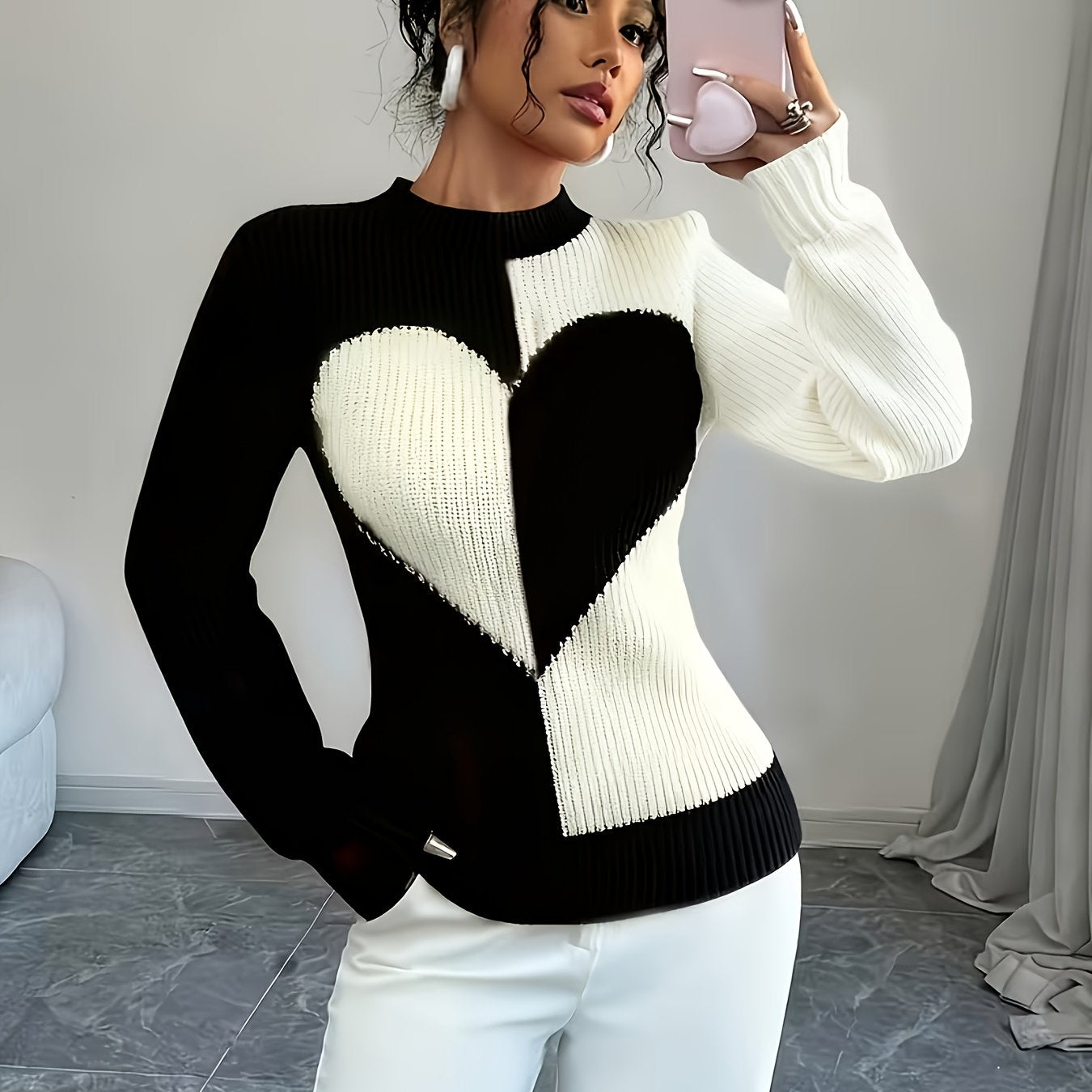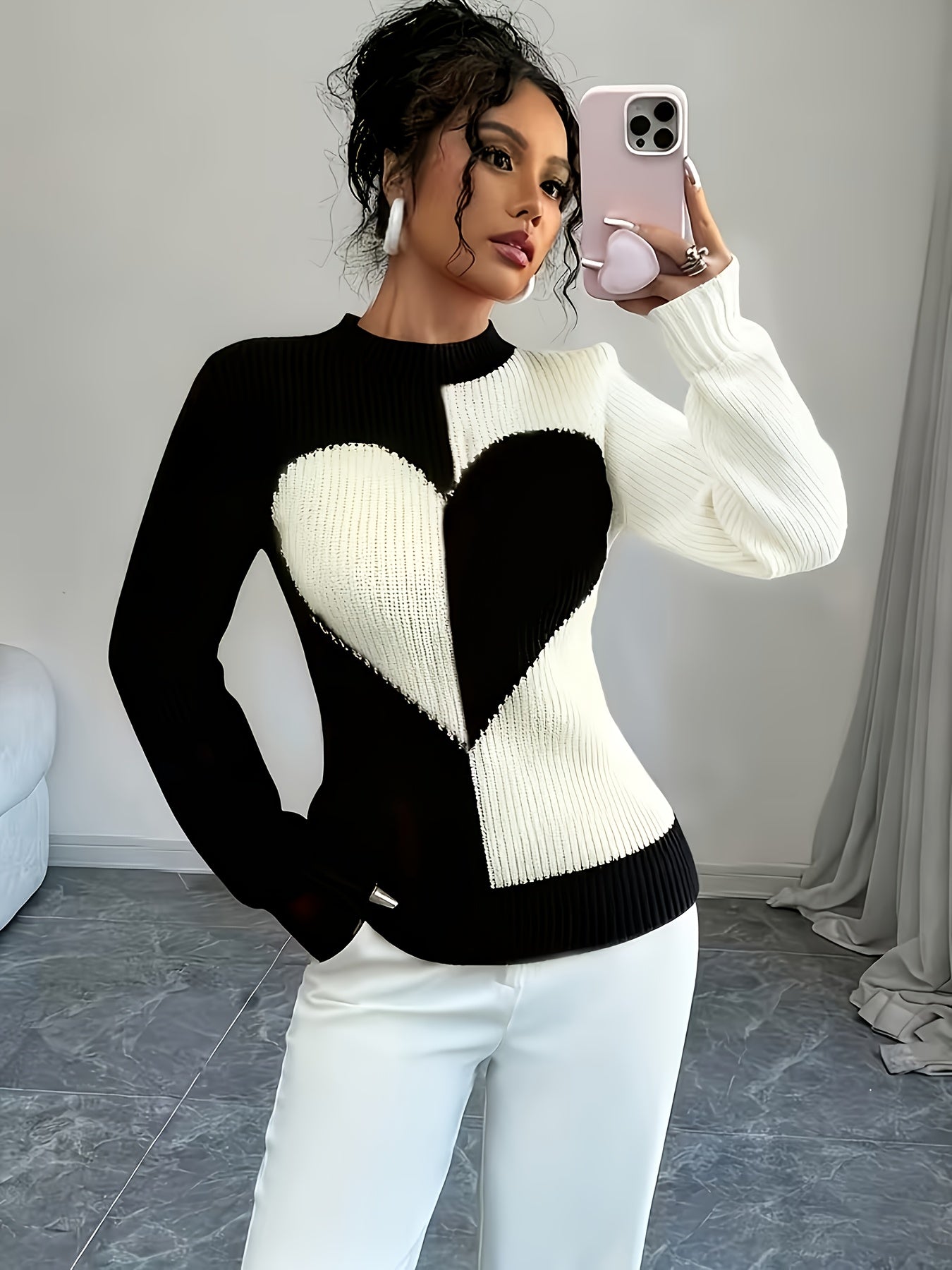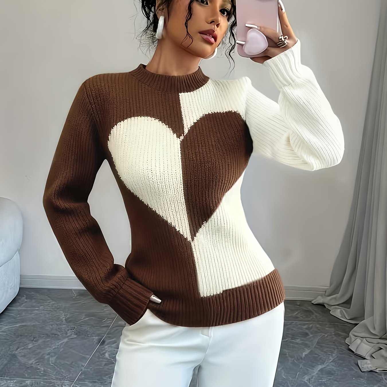 Deze comfortabele damestrui is perfect voor vrouwen die houden van een zachte, warme trui met een verzorgde uitstraling. Het subtiele hartmotief en het rustige kleurblokdesign geven de trui een speelse maar elegante touch, zonder overdreven te zijn.