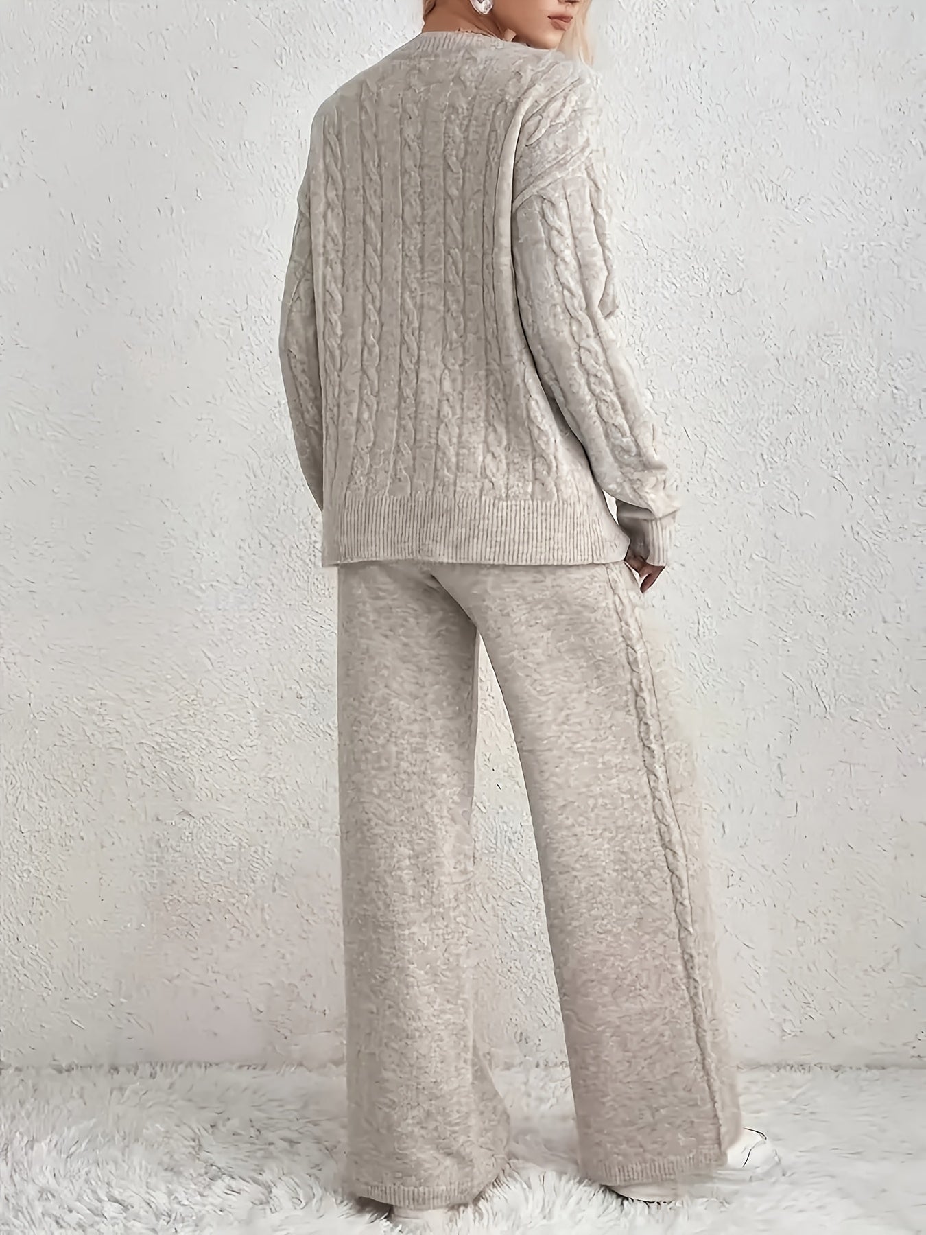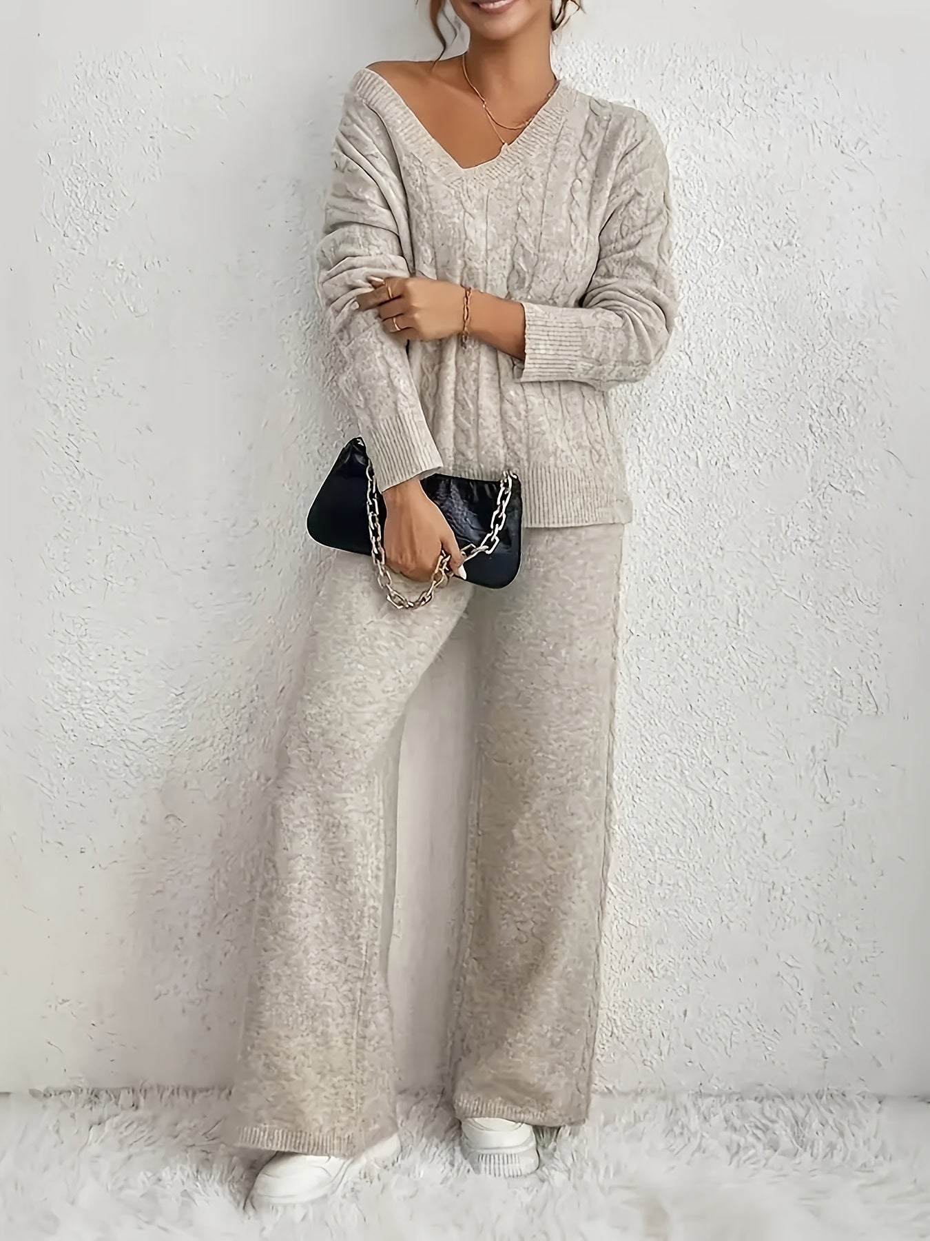 V-Hals Sweater en Wijde Broek Tweedelige Set - Fashionable & Casual